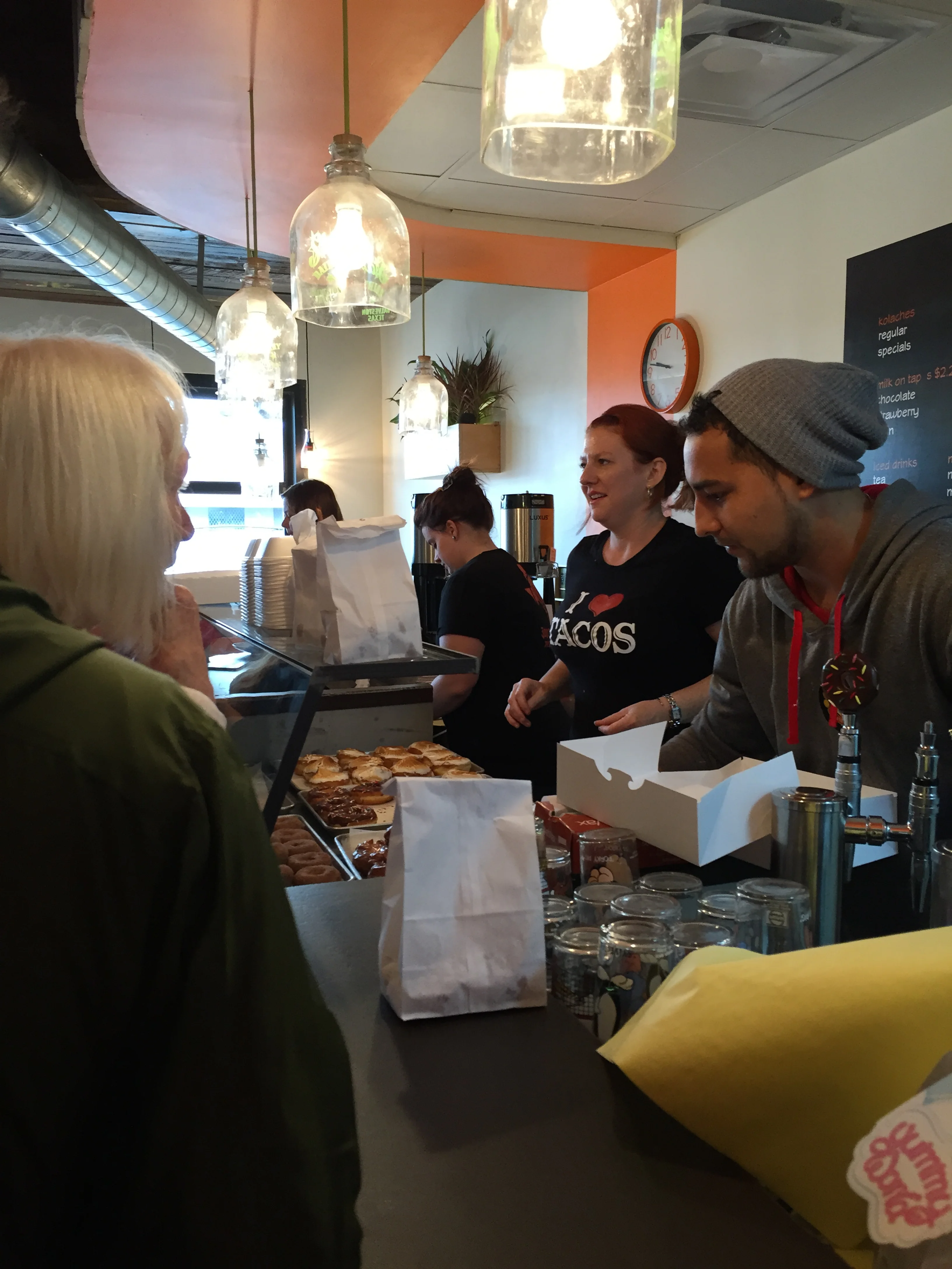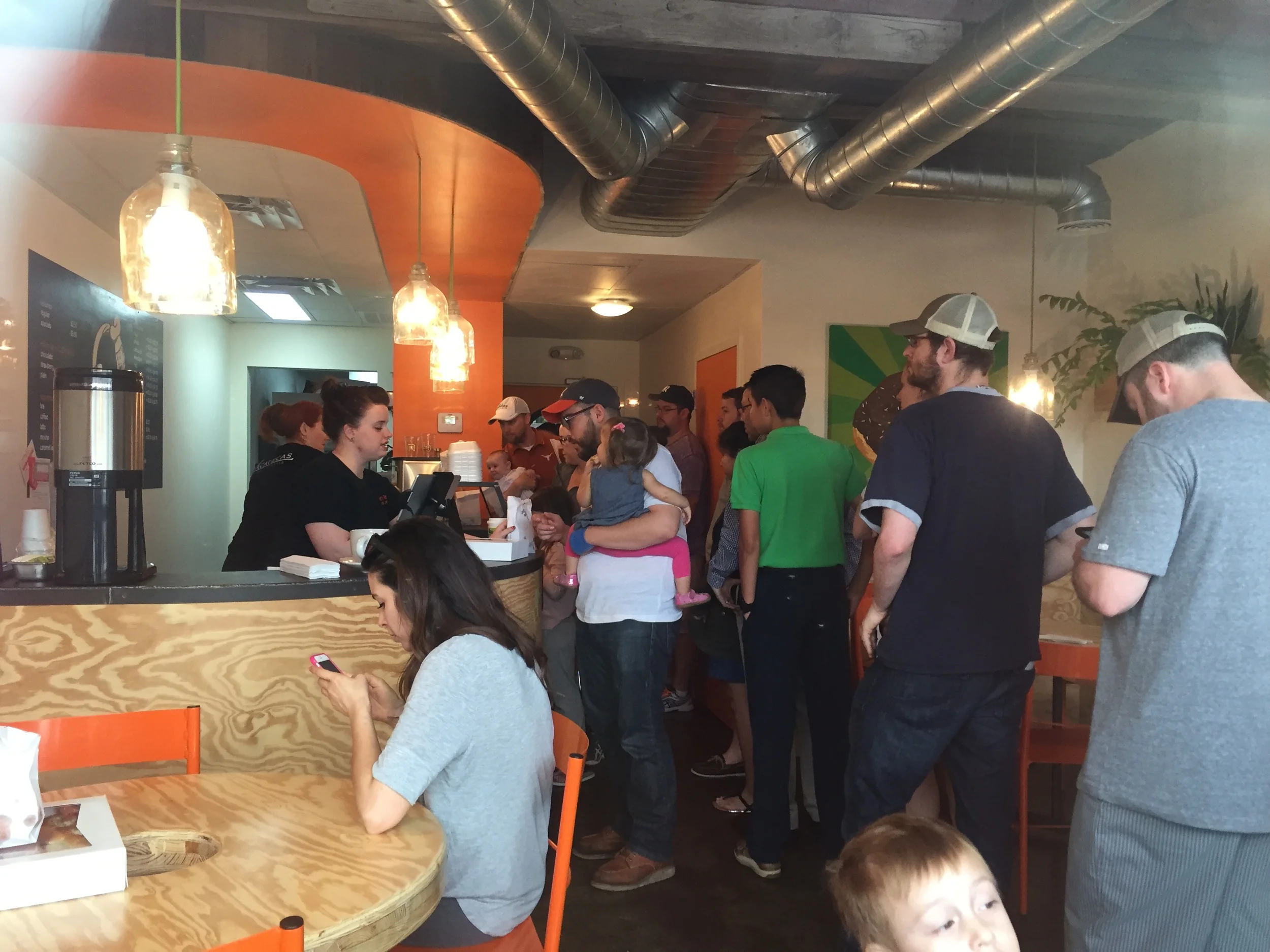 Small place. Long line. The wait is nothing in comparison to how long we've all been waiting for this place to open! We came by yesterday just after lunch and they were sold out and closed. Today we made sure to show up early, however it did cost us going to our class at church. The things I do to bring you all information!