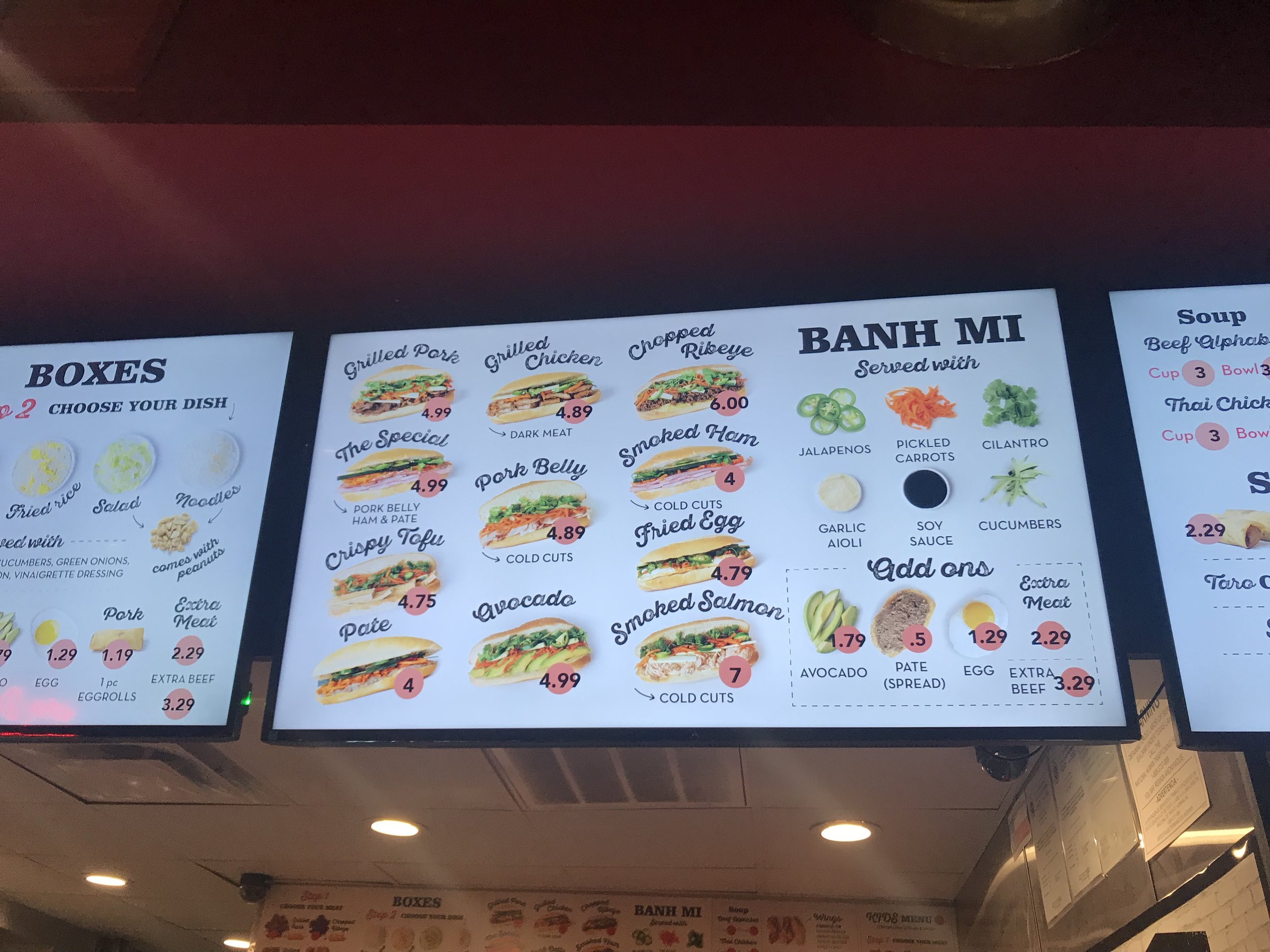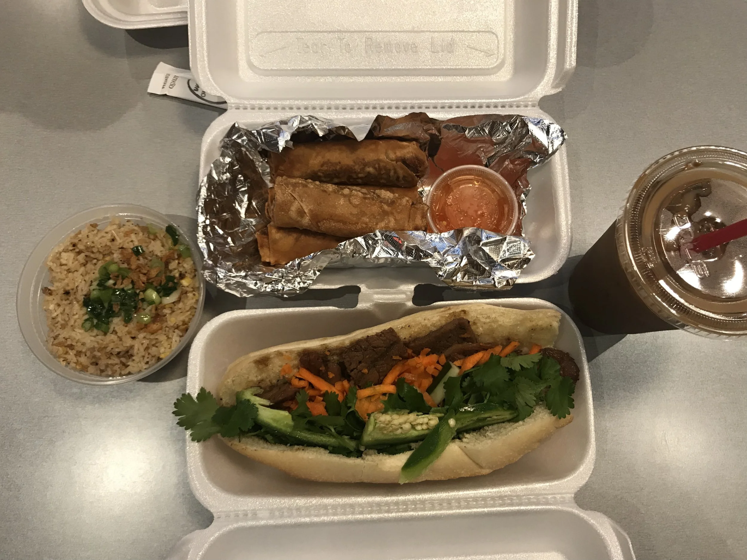Mentioned by a friend of mine, I happened to be in the area so made a quick stop and it’s a fast food type of place, which happens to be perfect for the moment as I’m on the way to a photo shoot. I’m looking at their menu and it’s kond of cool how they allow a lot of customization, but I go with the #1 Grilled Pork, their best selling. Ethan goes custom and gets the Ribeye with and egg, which turns out he didn’t like so much and only ate half, and didn’t want to take it home, which really doesn’t mean much as a 16 year old, he’s not really into leftovers and saving money. Anyway, I liked my Grilled Pork Banh Mi and I liked how spicy the jalapeno was...the only complaint was the bread was falling apart as I got through it, however it was soft. The egg rolls were good, Ethan ate 3 of the 8 (2 orders) and I had 2, and i did take the rest home for daddy, but Ethan ate those too. So the egg rolls are 16 year old and Soo approved! And baby Liam liked the kid’s fried rice! The iced coffee was pretty good too.