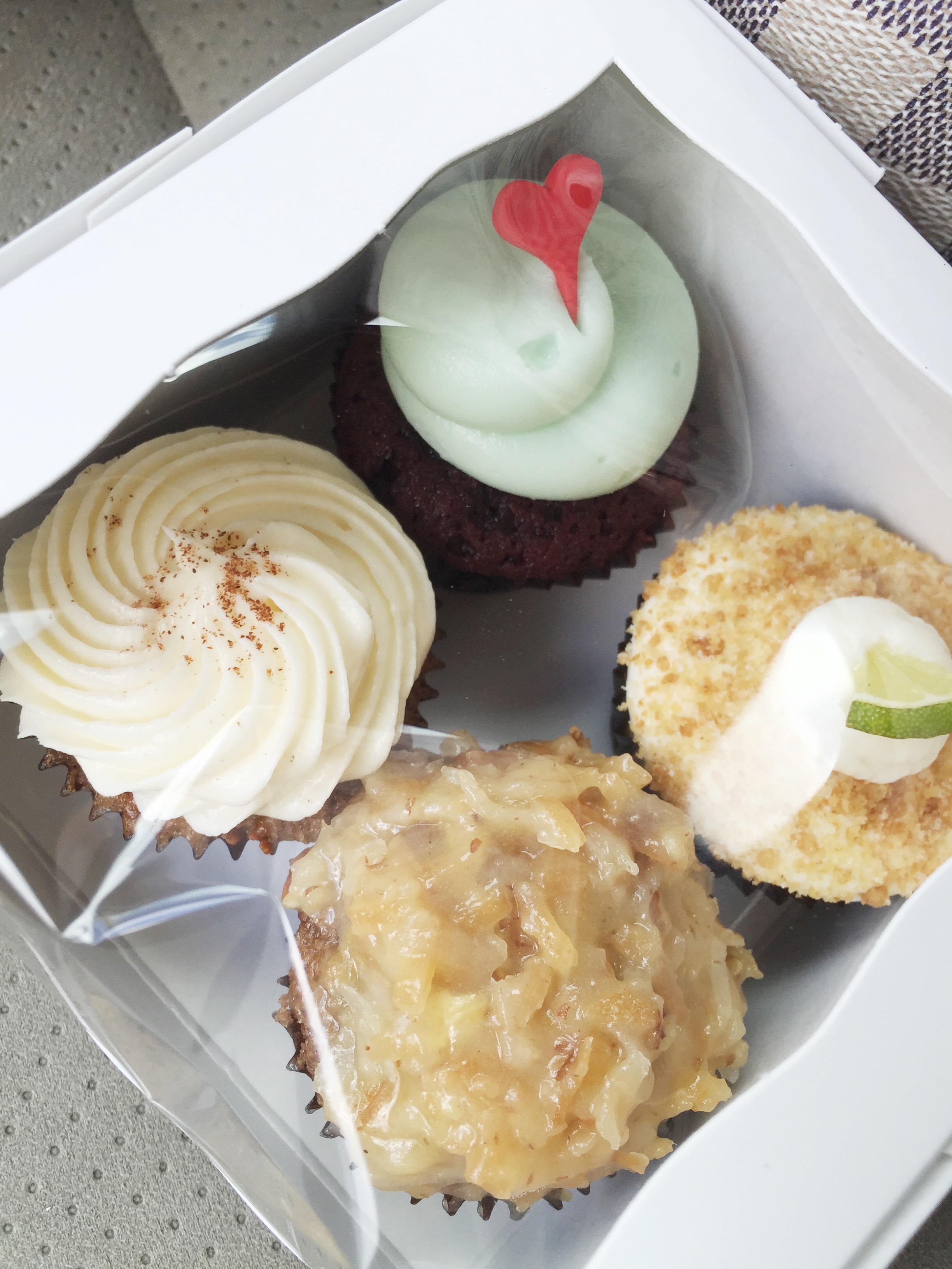 Not pictured here because I devoured it, is their new flavor Apple! I know, it sounds boring but it is sooooo good! I also had, which never disappoints, Key Lime, Red Velvet and German chocolate! I am always impressed at how delicious they are. Maria, the owner, is a genius!