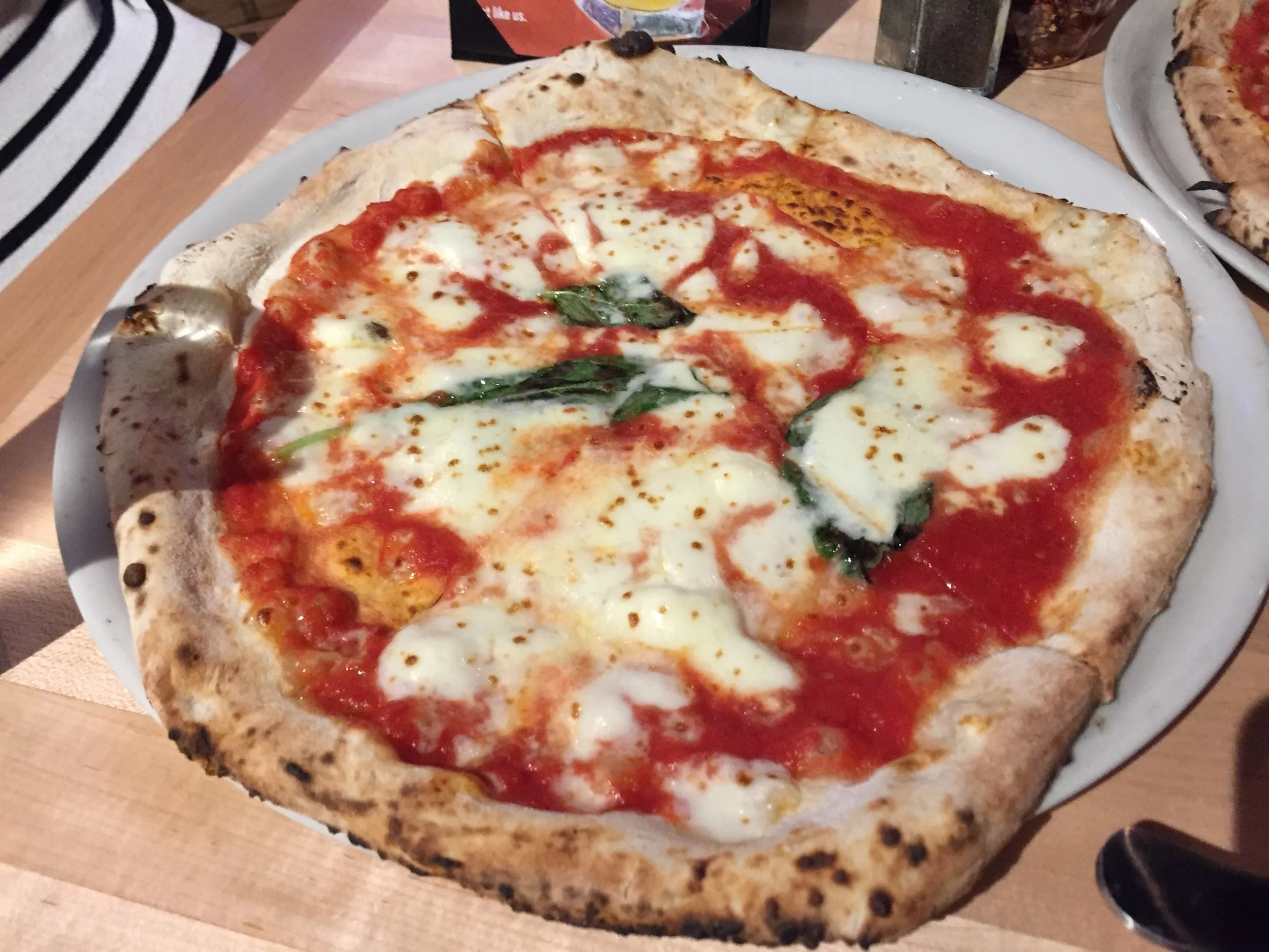 So I happen to read an article about the best pizzas in Houston, Napoletana style and not...and all the pizzas they listed I would have to agree with. They did list Cane Rosso as well, so of course I had to go try for myself. It's pretty casual dining. As I am now with child, we have to consider family friendliness, so on that front, CR checked out fine. On food, it was hard to pick, so many options! We decided to get "THE JOAN MARIE" pepperoni, housemade mozzarella, goat cheese, roasted jalapeno pesto $16 and I always have to get a Margherita, $13, to compare. They were both good, texture, taste, but I really didn't think the Joan Marie was that much more tastier than the Margherita, but I'm not complaining. We also got the CAPRA salad, field greens, crispy pancetta, dried cherries, toasted pecans, grape tomatoes, goat cheese, balsamic, $7. I have to say, this salad was really good and we got the small one, which was big enough for the 2 of us, but we're big salad eaters, so I think we could have gotten the $12 portion, which our server says feeds 4 people. And it was better than what I have had at Pizaro's. We definitely liked our experience, I think we'll revisit here before we go back to Pizaro's, for that salad!